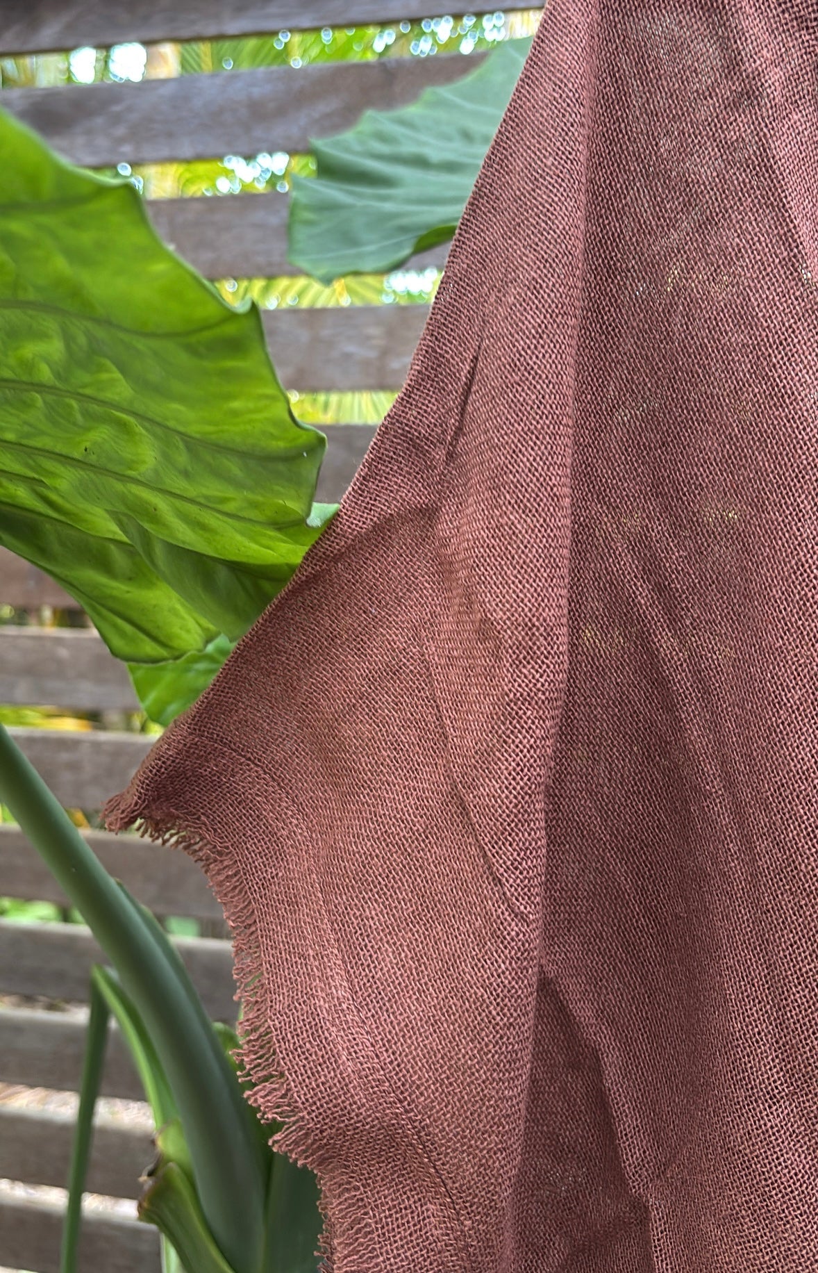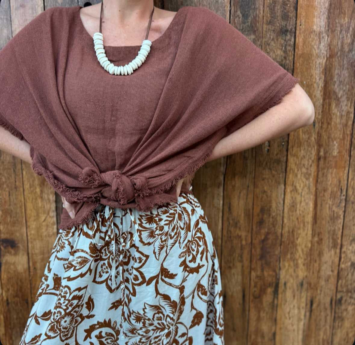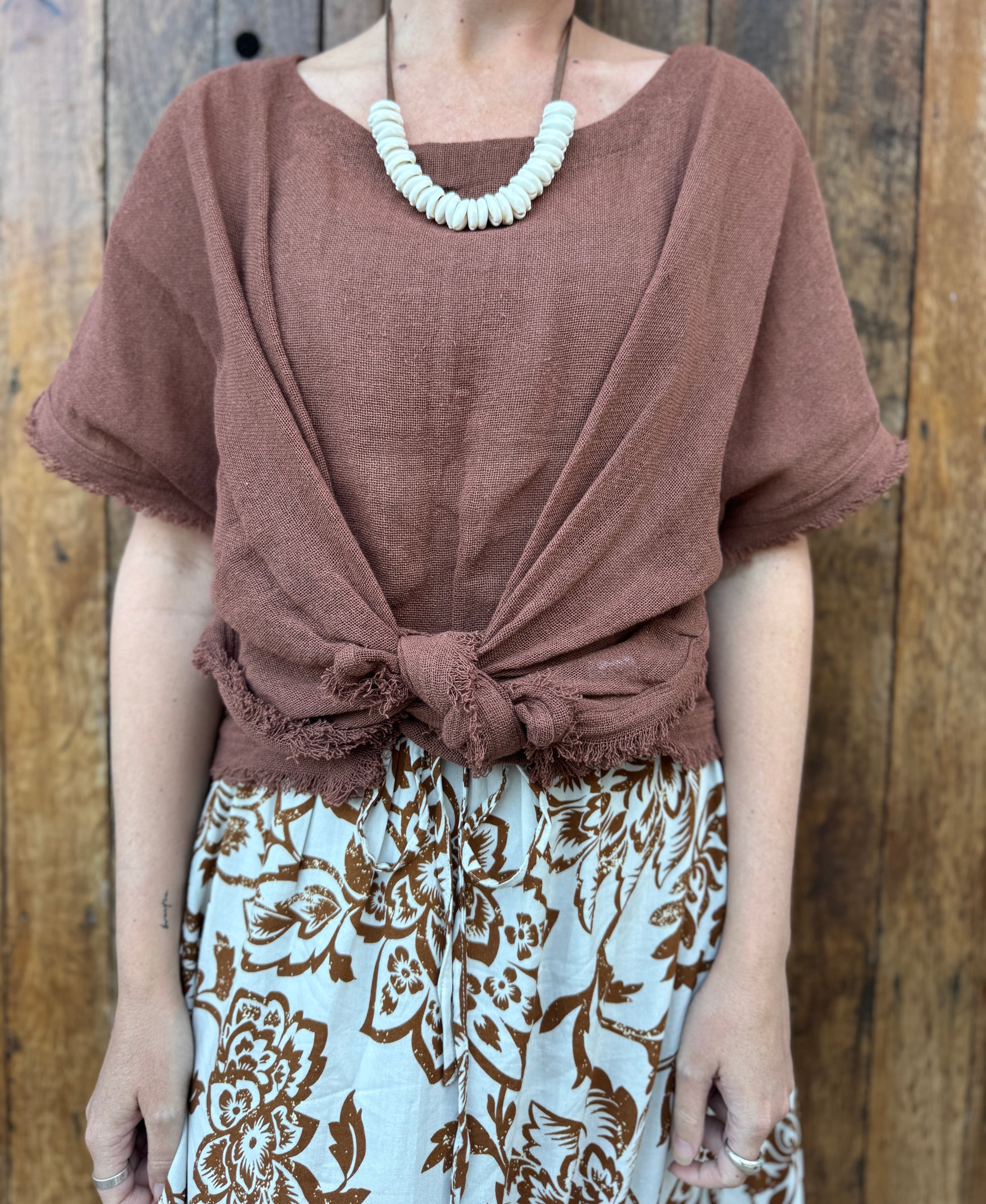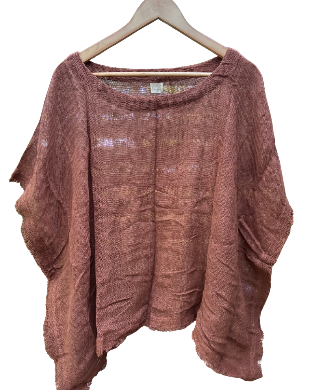 This beautiful throw top is crafted from a luxurious natural fibre, making it both sustainable and eco-friendly. The fine ramie cotton weave allows for breathability and a graceful drape on the body. The versatile wide neckline adds a feminine touch and can be worn off the shoulder for a relaxed boho style. With charming frayed details on the sleeves and bottom hem, and subtle side splits, this top has a rustic, earthy aesthetic.